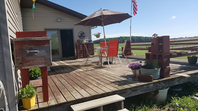 Aside from all the yard work I've been doing I was finally able to finish planting my flowers and cleaning up the deck! I've had to put the plants under cover a lot because of all the storms we've had. I certainly don't want to lose them! I do that every year, but this year we are having a LOT more storms than normal. Like every other day or every third day. That's very unusual for North Central Wisconsin. So, I've often times felt like the "Dunkin Donuts" guy -- put the flowers away; take the flowers out. OYE!