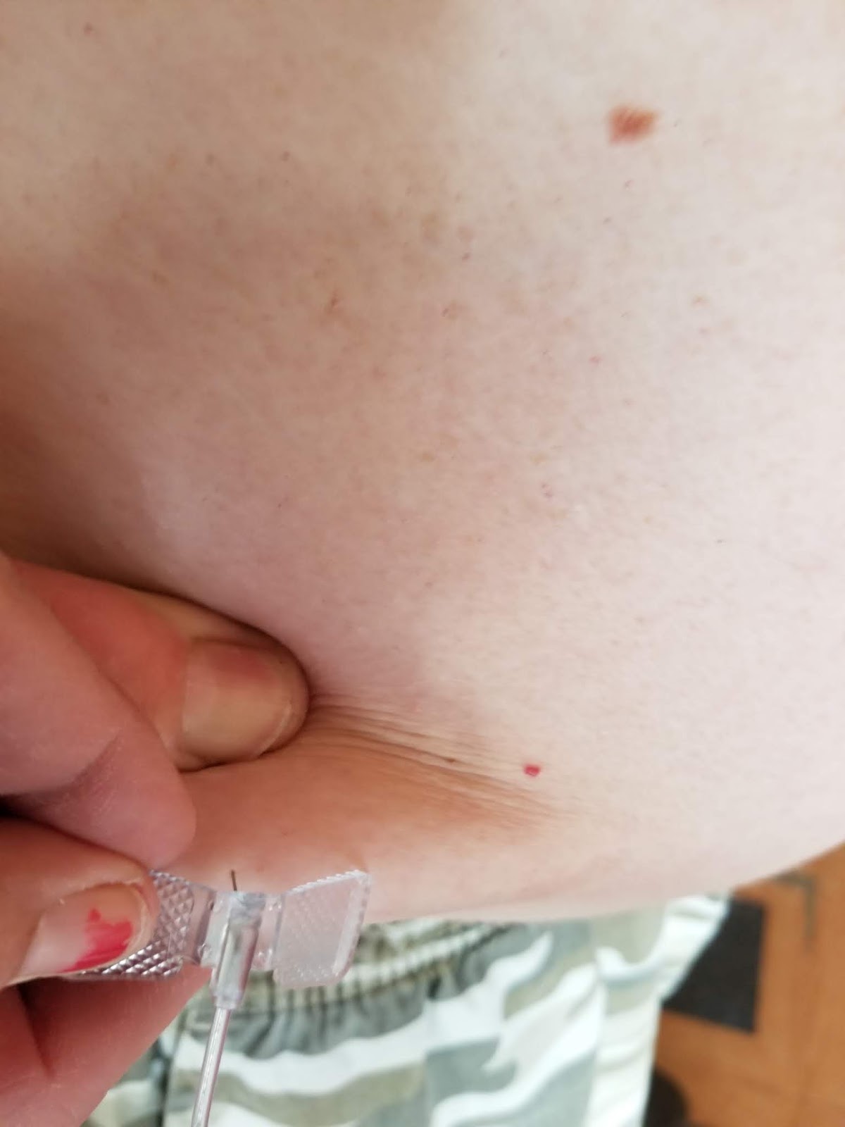 To insert the needle, you simply have to grab a bit of your love handles and, after cleaning with an alcohol wipe, insert the needle. Greg has said it's much like a mosquito bite. There are five needles in all, so we put three on one side of his belly and two on the other and cover with